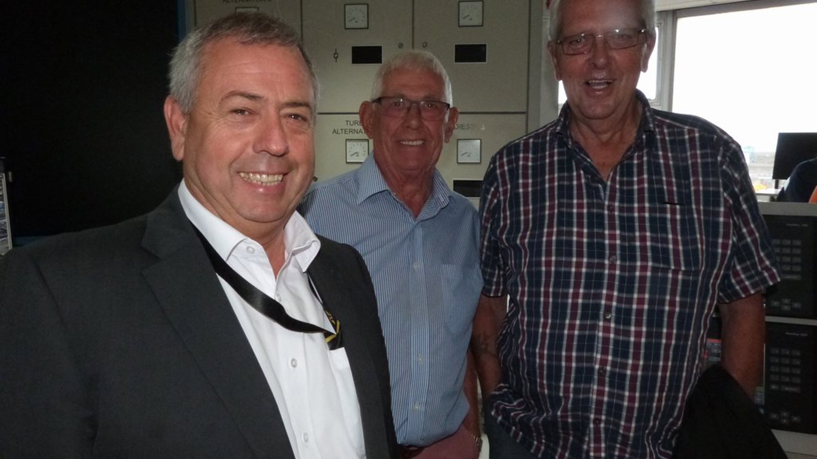 We today marked 50 years since the first units of electricity were generated at La Collette Power Station with a small celebration and a rather large cake enjoyed by current Power Station staff, including JE’s longest serving employee, John Smith (43 years), and several pensioners who worked in the Power Station during its early days. They included Ken Baudains, (pictured above with JE CEO Chris Ambler) one of the three shift engineers who signed the ledger on the first day of generation, 29 September, 1966.